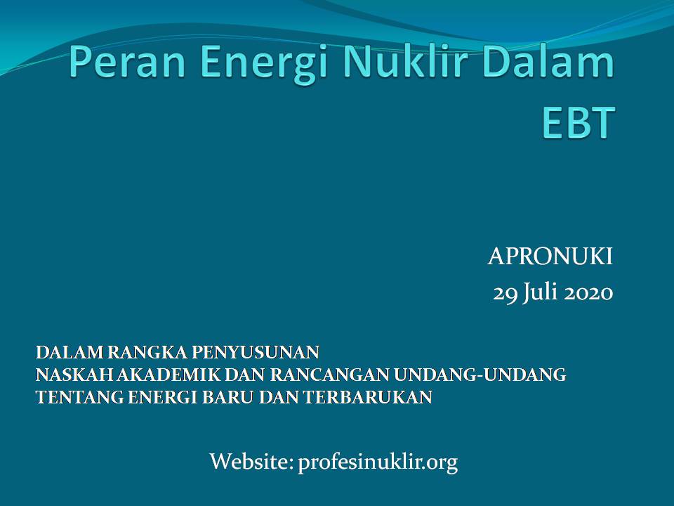 On the basis of a letter from the Secretariat General and the Parliament Expertise Body no: BK / 08019 / SETJEN AND BK DPR RI / PU / 7/2020, a Focus Group Discussion (FGD) was held in the framework of drafting an academic paper and draft law on New Energy and Renewable (EBT). The discussion related to this is the second stage of the first discussion on May 22, 2019 (letter no: BK / 077686 / SETJEN DAN BK DPR RI / PU / 05/2019). In the 2nd Term Of Reference discussion, it was stated that if we see the development of the utilization of new and renewable energy which is less than optimal, the option of realizing nuclear power plants should be put forward and not only as a last choice, as in Government Regulation (PP) No. 79 of 2014 concerning National Energy Policy. The next problem that needs to be answered when this option is put forward includes, are we ready to build a nuclear power plant? How is the development of the use of nuclear energy for electricity generation today globally? What about the risks and the level of security and safety of nuclear power plants today? How is the readiness in terms of costs, mastery of technology, human resources, and raw materials? What kind of support is needed to make this option possible? What forms of regulation need to be prepared in the regulation? What about the current level of public acceptance of nuclear power plants? APRONUKI answers these questions in the form of a presentation delivered by the Chairperson of APRONUKI as shown in the following slide. The PUU BK-DPR RI FGD with APRONUKI was attended by 19 participants.