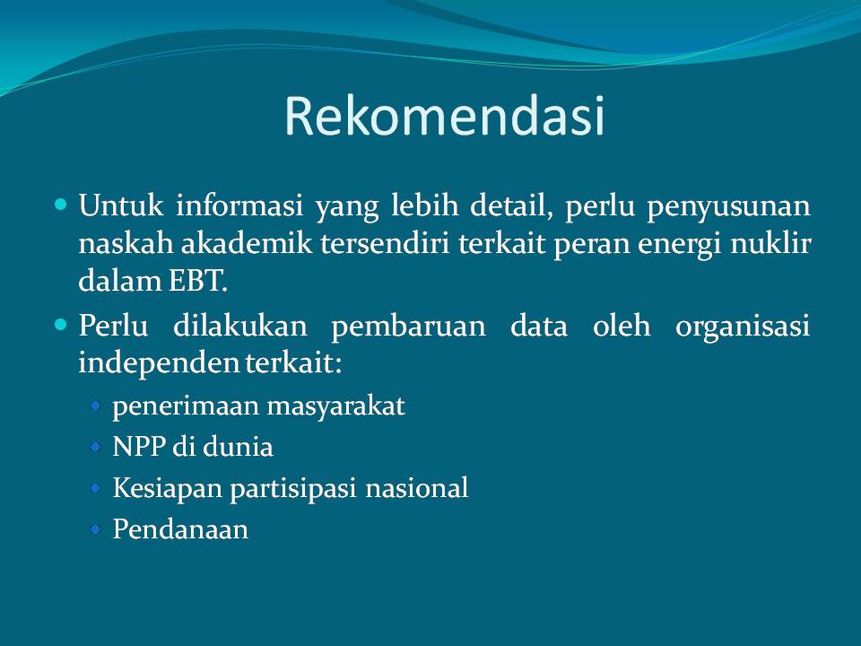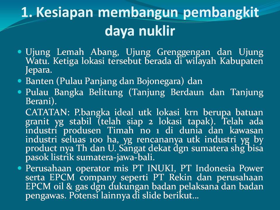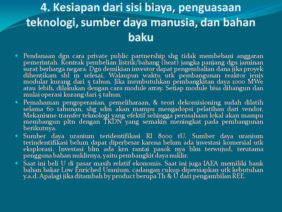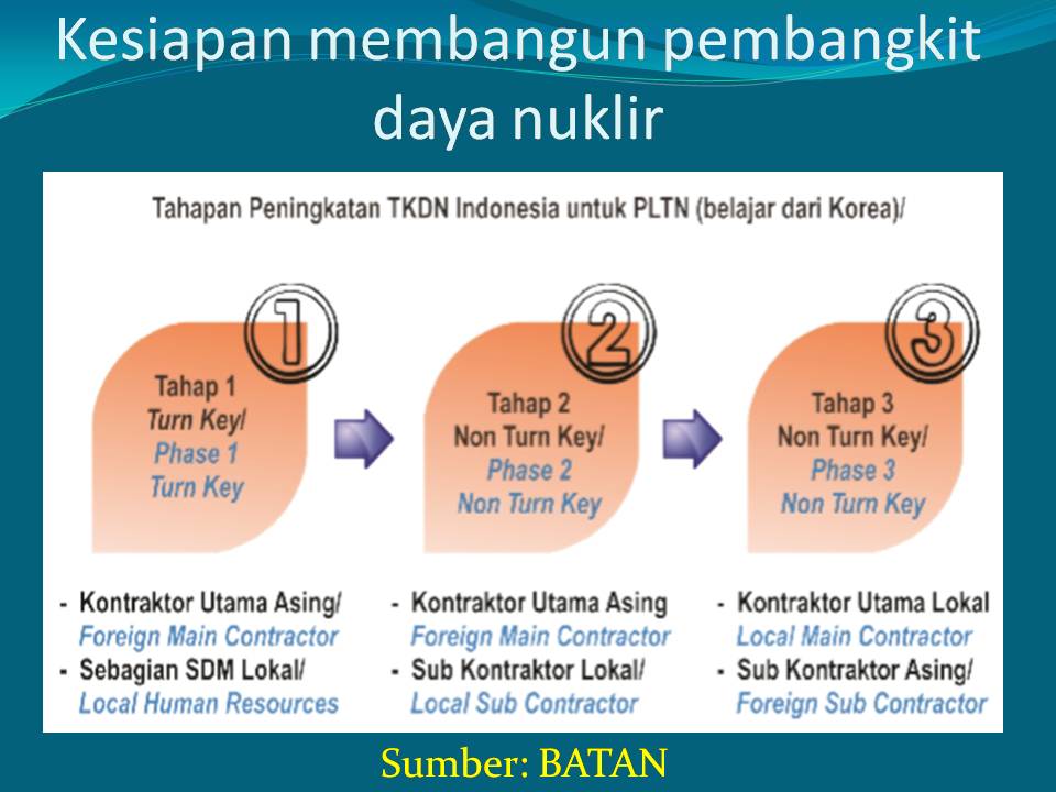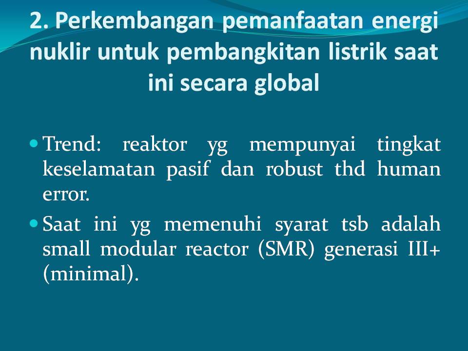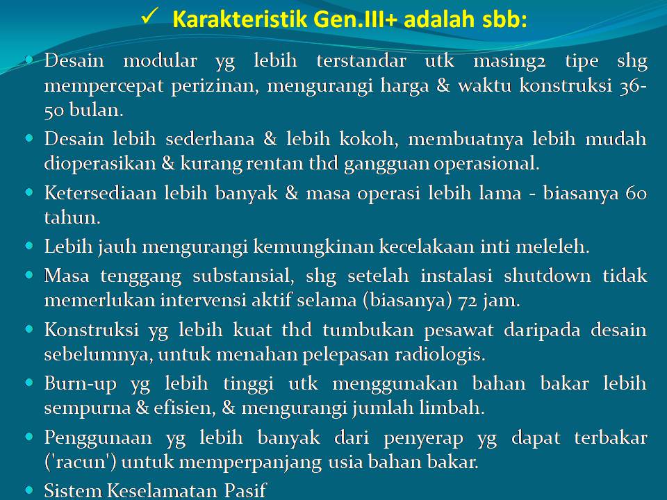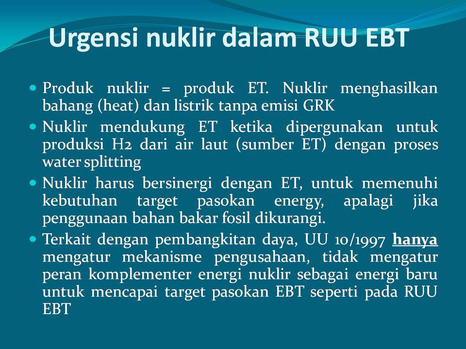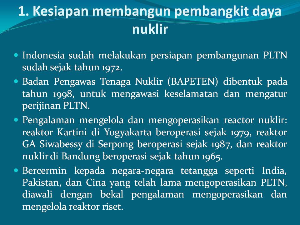 Hydrogen is obtained from the water splitting process, especially from the abundant sea water. Fossil fuels can be also converted to hydrogen. The process of making hydrogen, both from water splitting and conversion from fossil fuels, requires heat. Considering the Indonesian government’s commitment to reduce GHG emissions, the generation of such heat should not lead to GHG emissions. Nuclear power plant generate heat and electricity without emitting GHG.