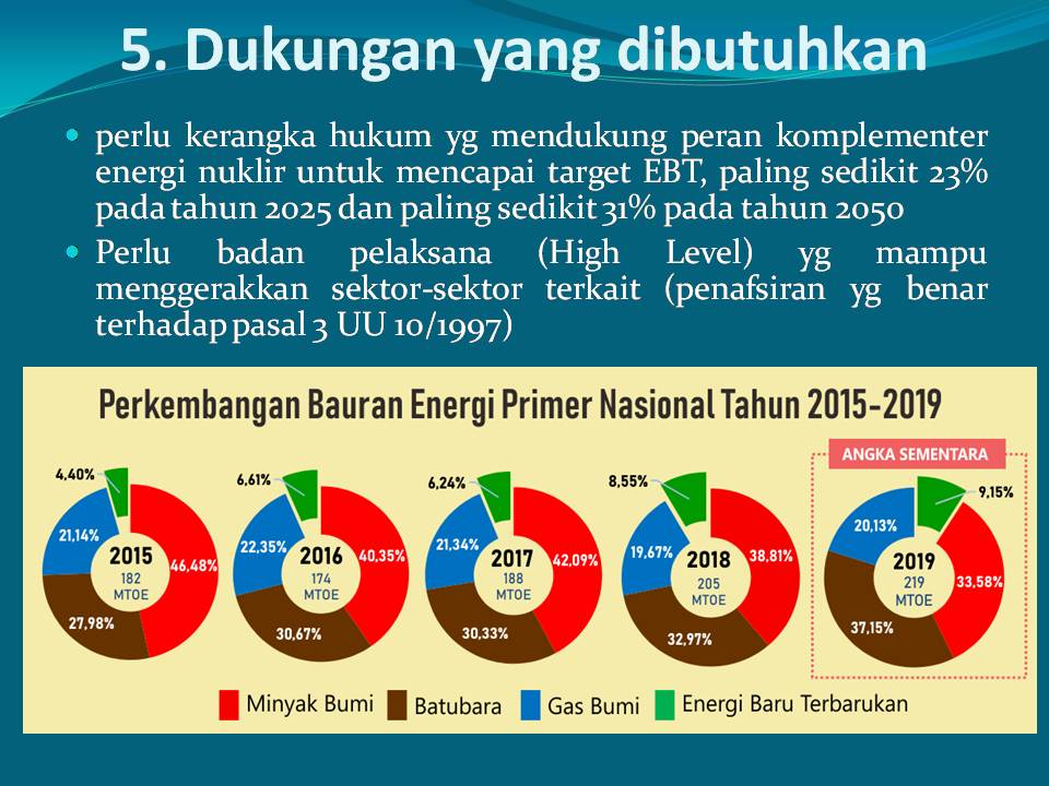 The 2019-2024 RPJM (National Medium Term Development Plan) states that strengthening economic resilience is aimed at growth while still adhering to the commitment of the Indonesian government in the UNFCCC COP 21 of 2015 to reduce greenhouse gas emissions by at least 29% by 2030. For this purpose, it is necessary to strengthen the capacity in managing economic resources and using them to produce goods and services with high added value to meet domestic and export markets. In this context, efforts must be made to increase the GDP contribution of the non-oil and gas processing industry, especially by increasing the contribution of exports of high-tech industrial products. Fulfilling energy needs in this context must prioritize increasing the use of New and Renewable Energy (NRE). If Indonesia relies on its energy supply in a business as usual manner (using EBT 19% of the total energy supply in 2027), then the total CO2-equivalent emissions in 2027 (based on calculations) will reach 234 million tonnes CO2-equivalent. As an illustration, in 2017 the use of EBT was only 8% of the total energy supply in Indonesia. On the basis of calculations, if using EBT 31% of the total energy supply for Indonesia (around 350 TWh) by 2027, the emissions will be reduced by 16% from 234 million tonnes CO2-equivalent. If we use EBT 43% of the total energy supply, emissions are reduced by 36%. The problem is the question related to the ability of NRE energy supply, whether it is able to provide a supply of 31% or even 43% of the total energy supply needs for Indonesia in 2027. Emission reduction requires NRE with a large capacity, as energy suppliers from fossil fuels such as coal. The energy supplier, which has been shown to be able to compete with the energy supply capacity of fossil fuels, is nuclear. The cost of generating electricity from nuclear power plants is more expensive than the costs of generating electricity from coal power plants? Currently in Indonesia, it is illustrated that electricity from nuclear power plants is expensive. Meanwhile, electricity from coal-fired power plants is cheap. This image needs to be examined more carefully, whether the current calculation of electricity prices takes into account the cost of externalities and even the cost of carbon. The cost of externality includes the cost of damage due to PM10, SOx and NOx pollution, while the cost of carbon (i.e. in the form of CO2) is the cost of reducing carbon emissions, for example by means of carbon capture / sequestration or in the form of carbon taxes taken by the government to finance efforts to reduce carbon emissions. BATAN researchers have reviewed the cost of pollution damage on the basis of 2003 references. As a result, the cost of damage due to pollution from PM10, SOx and NOx emitted by PLTU Suralaya, Banten = 23.40 mills $ / kWh. BATAN researchers have also calculated the assumption that the cost of CO2 capture / sequestration is 30 $ / MT CO2 (conversion factor of cost per MT carbon to cost per MT CO2 = 3.7), the result is that the calculation of the cost of carbon in Indonesia = 25.47 mills $ / kWh. On the basis of these calculations, it means that the cost of generating coal PLTU coal, in this case represented by the Suralaya Banten coal-fired power plant, must be added to the cost of damage due to PM10, SOx & NOx emitted by the Suralaya PLTU coal power plant and carbon costs of 48.9 mills $ / kWh. Conclusions from the study by BATAN researchers: 1. The cost of generating electricity from coal-fired power plants without external costs and carbon costs is between 43 to 61 mills USD / kWh, meanwhile the calculation of the cost of generating electricity for High Temperature Gas Cooled Reactor (HTGR) nuclear power plants in Indonesia is between 41 mills USD / kWh to 47 mills USD / kWh. 2. If the cost of externalities is taken into account in the cost of generating electricity from the Suralaya coal-fired power plant, the cost of generating electricity from the Suralaya PLTU will be between 89 mills USD / kWh to 107 mills USD / kWh, and will be even more expensive if the carbon costs are taken into account, which is between 114 mills USD / kWh to 133. mills USD / kWh. While the cost of generating HTR electricity remains unchanged, it remains between 41 mills USD / kWh to 47 mills USD / kWh, as there are no external costs and no carbon costs. NOTE: The latest data on China’s HTR investment price is € 667 million and the electricity price for optimal investment is 79 € / MWh = 9.32 cents USD / kwh (1 € = 1.18 USD).