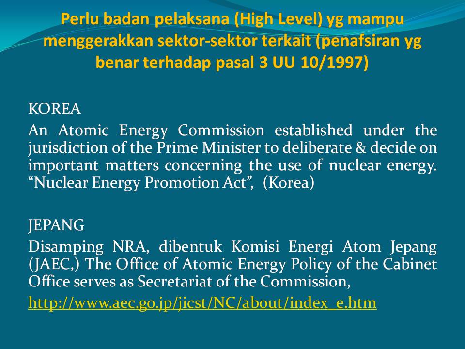 Based on the new paradigm of national law and the global safety/security, it is required a new nuclear governance which accommodates all 5 state powers: policies (beleid) & administrative actions (bestuursdaad), regulatory act (regelendaad), management (beheersdaad), supervision (toezichthoudensdaad) in a balanced way.