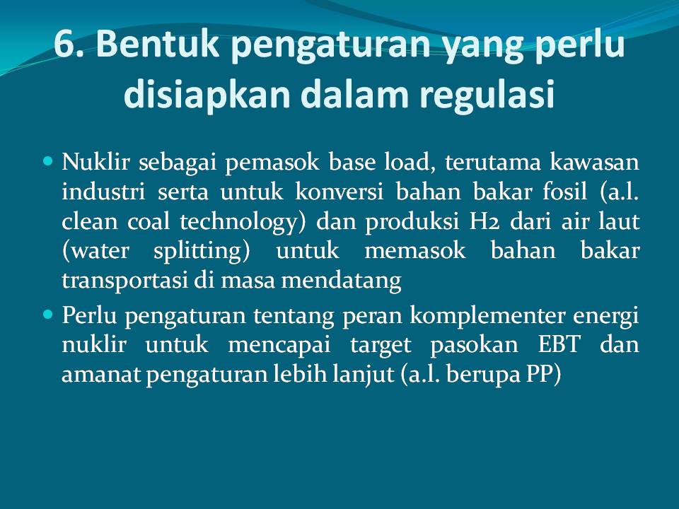 5. Initial discussion on 17 focus review areas was conducted in a focus group discussion (FGD) with BAPETEN. In the focus area (focus area 7 on safety analysis) it is proposed to apply the risk-based review principle to determine the relevance of each focus area for reviewed nuclear power plants. In the FGD, BAPETEN stated that licensing of new types of reactors (such as MSR and HTGR) could be carried out with licensing mechanisms on the basis of experiments. For this reason, the reactor vendor can work with the Implementing Agency (BATAN) to build an experimental reactor.